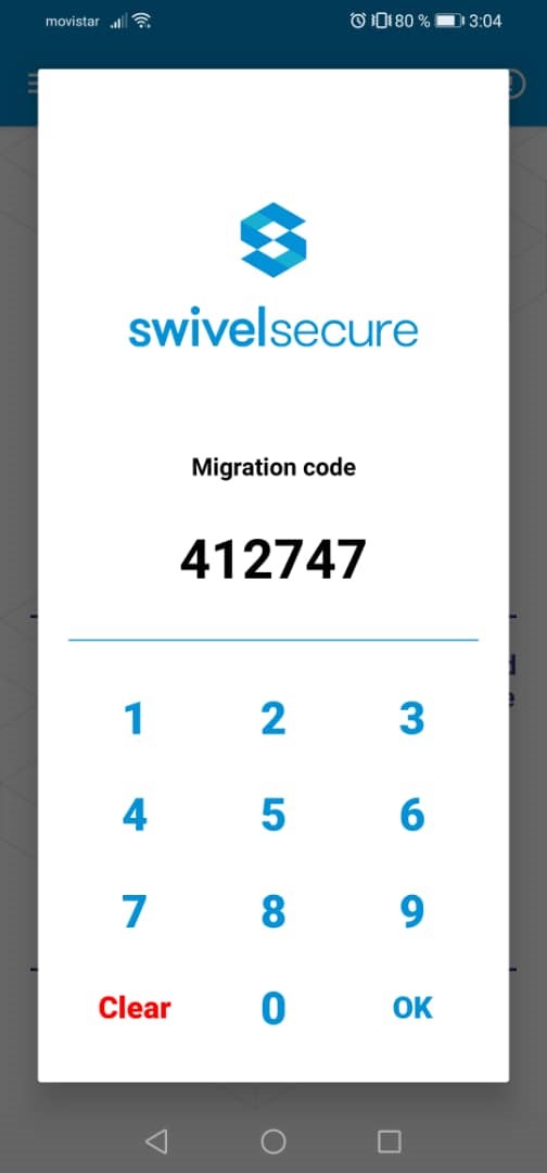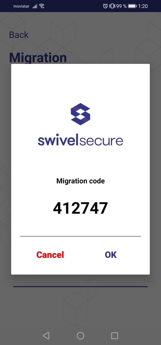 Step 6: Press the “Get the token” option. Once you have clicked on the “Get the token” option, a dialog window is displayed with the Migration Code and two options: “Cancel” and “OK”. Memorize (write down) the Code, click the “OK” option, minimize the application and enter the AuthControl Mobile V5 application (see figure 7).