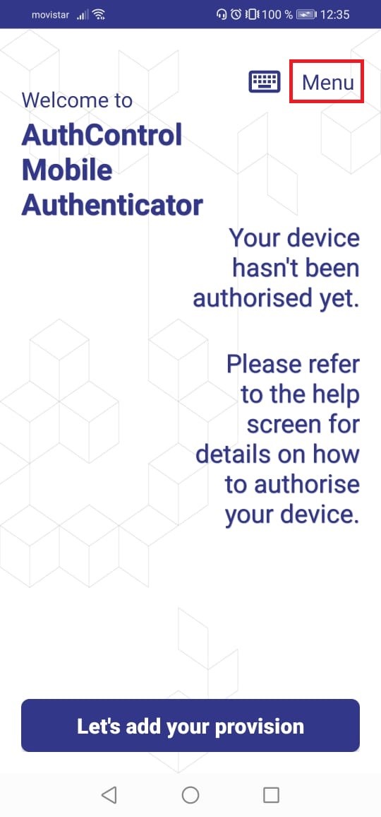 Step 3: Launch the AuthControl Mobile Authenticator (AMA) app, once on the home page of the app, click on the Menu option located at the top right of the screen (see figure 64).