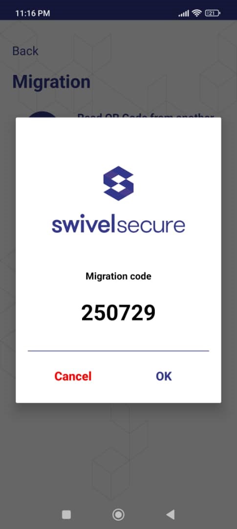 Step 9: Click on the “Create QR Code” option, a dialog box is displayed for you to enter the Migration code, with the “Cancel” and “OK” options (see figure 71).